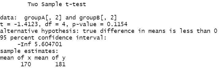 t.test(groupA[,2], groupB[,2], alternative = "less", var.equal = TRUE)