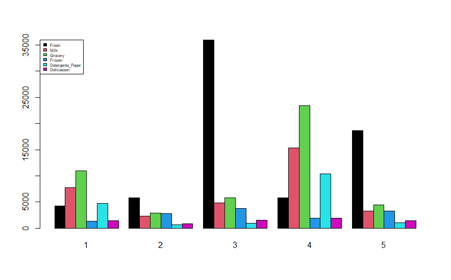 barplot(t(df.kmeans$centers), beside = TRUE, col = 1:6)