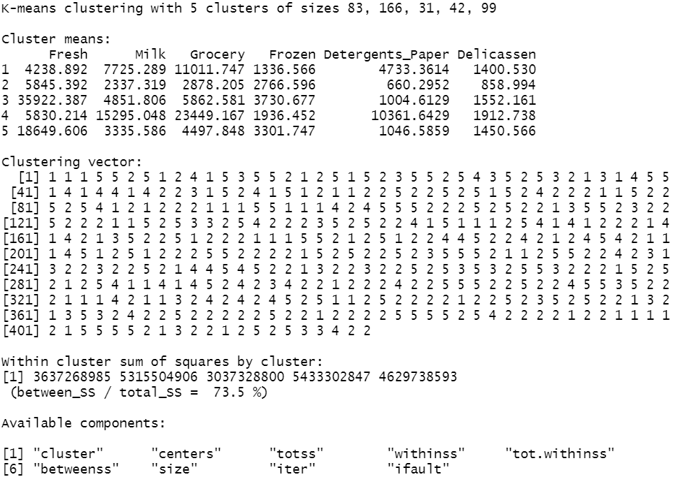 df.kmeans <- kmeans(df.rm.outlier[,3:ncol(df.rm.outlier)], centers = 5, iter.max = 1000)