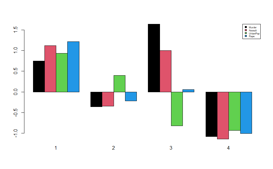 barplot(t(df.means[,-1]), beside = TRUE, col = 1:4, names.arg = c(1:4))