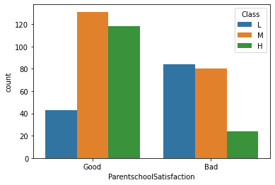 sns.countplot(x='ParentschoolSatisfaction', data=df, hue='Class', hue_order=['L', 'M', 'H'])