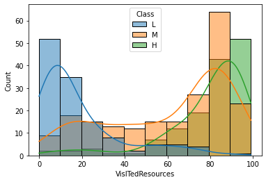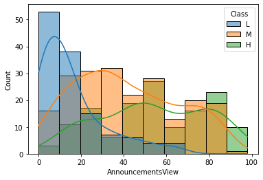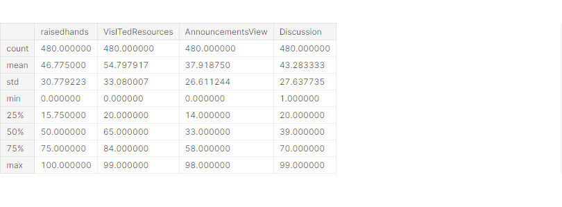 수치형 데이터: raisedhands, VisITedResources, AnnouncementsView, Discussion