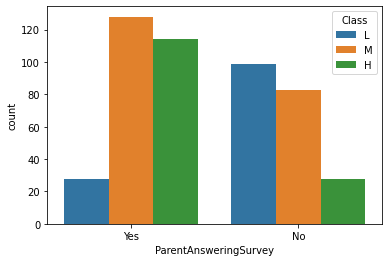 sns.countplot(x='ParentAnsweringSurvey', data=df, hue='Class', hue_order=['L', 'M', 'H'])