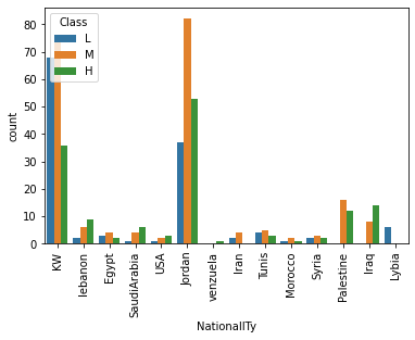 sns.countplot(x='NationalITy', data=df, hue='Class', hue_order=['L', 'M', 'H'])