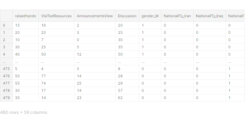 X = pd.get_dummies(df.drop(['ParentschoolSatisfaction', 'Class', 'Class_value'], axis=1),