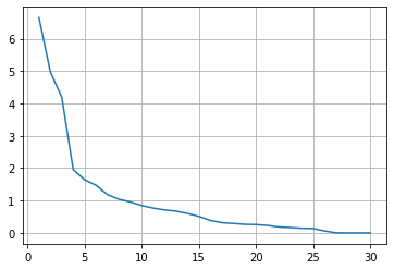 plt.plot(range(1, len(pca.explained_variance_) + 1), pca.explained_variance_)