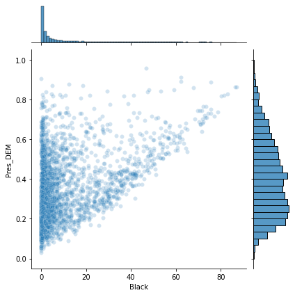 sns.jointplot(x='Black', y='Pres_DEM', data=df_norm, alpha=0.2)