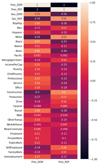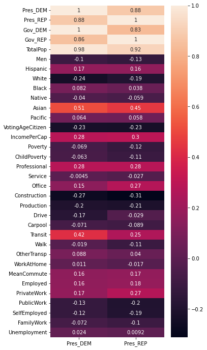sns.heatmap(df_norm.corr()[['Pres_DEM', 'Pres_REP']], annot=True)