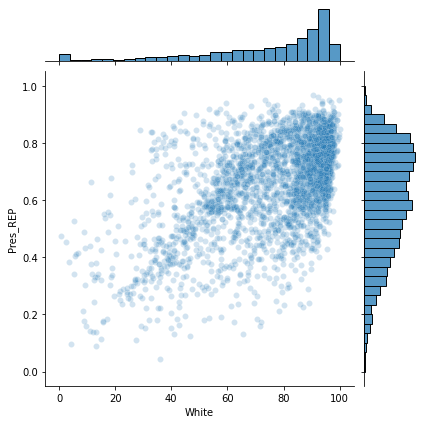 sns.jointplot(x='White', y='Pres_REP', data=df_norm, alpha=0.2)