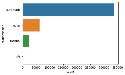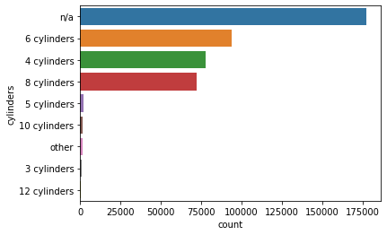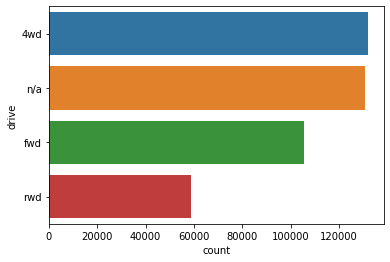 범주형 데이터: id, url, region, region_url, manufacturer, model, codition, cylinders, fuel, title_status, transmission, VIN, drive, size, type, paint_color, image_url, description, state, posting_date