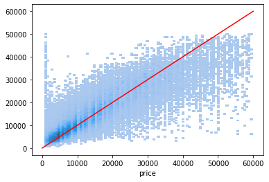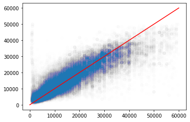 plt.plot([0, 60000], [0, 60000], 'r-')