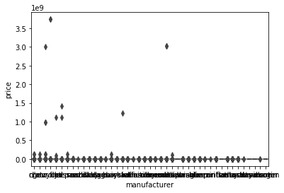 sns.boxplot(x='manufacturer', y='price', data=df)