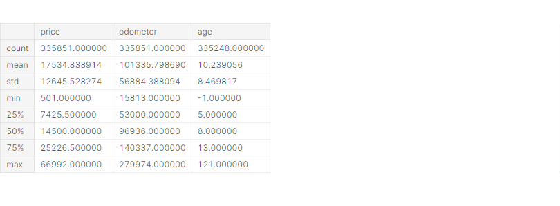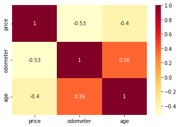 price(가격)는 age, odometer와 음의 상관관계를 가진다.
