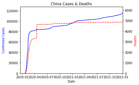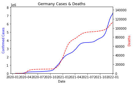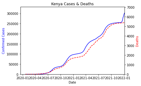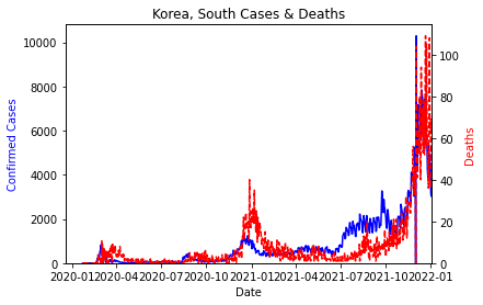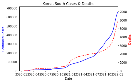 # 특정 국가의 확진자 수 및 사망자 수 변화 시각화