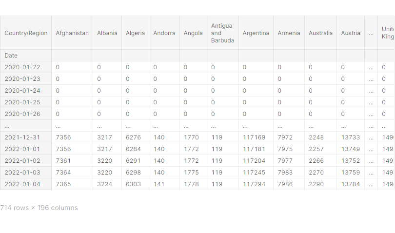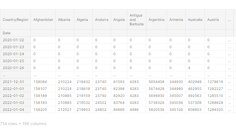 df = df.drop(['Lat', 'Long'], axis=1).groupby('Country/Region').sum()