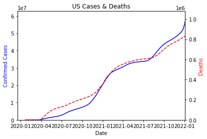 # 왼쪽 y축에는 확진자 수, 오른쪽 y축에는 사망자 수 표시