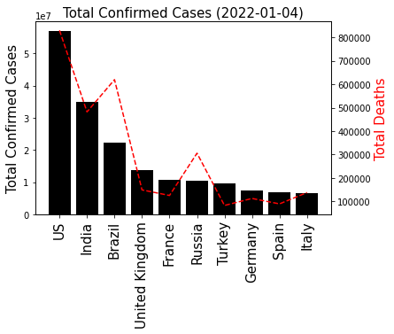 # 나라별 확진자 수 및 사망자 수 시각화 (최신일자, 가장 많이 확진된 10국가)