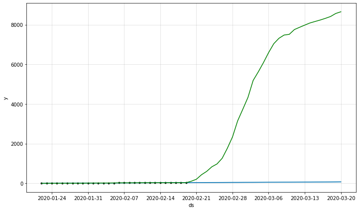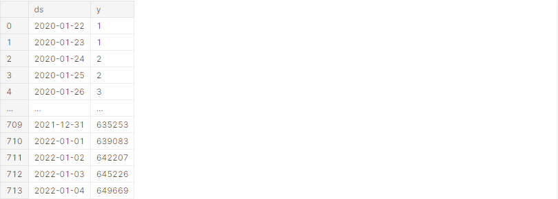 # 한국의 확진자 수 데이터를 FBProphet에 학습하기 위한 데이터 프레임으로 재구성
