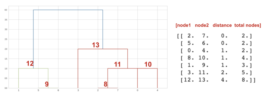 # 샘플 데이터를 통해 linkage matrix 구조 파악