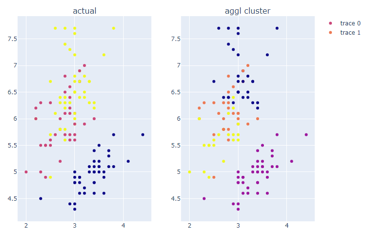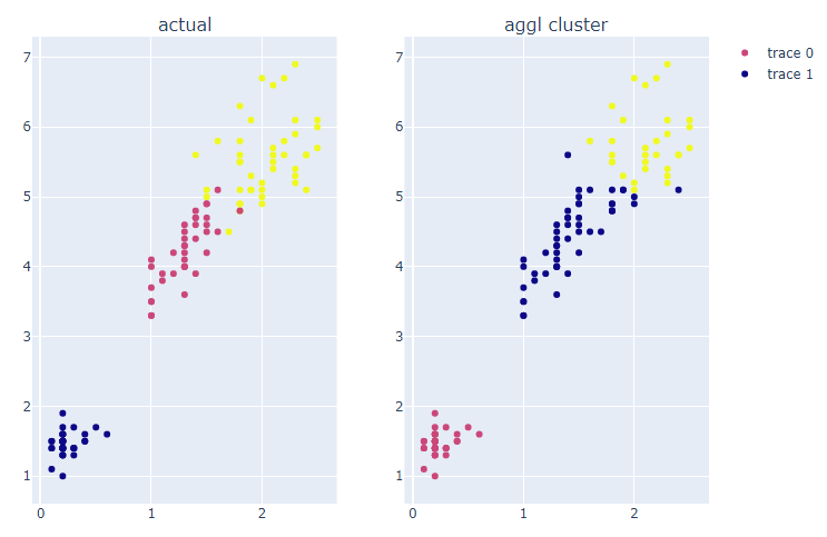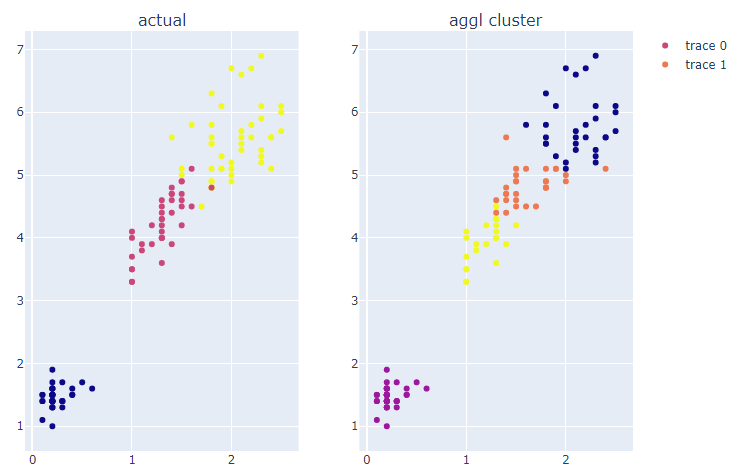 fig = make_subplots(rows=1, cols=2, subplot_titles=('actual', 'aggl cluster'))