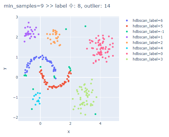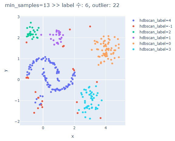 fig.update_layout(width=600, height=500, title=f'min_samples={ms} >> label 수: {len(set(hdbscan_label))}, outlier: {outliers}')