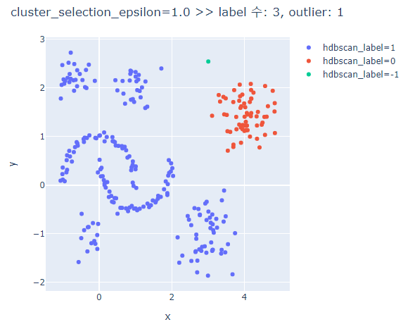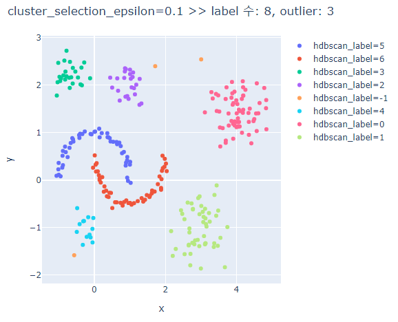 cluster_selection_epsilon가 클수록 하나의 군집으로 분류된다.