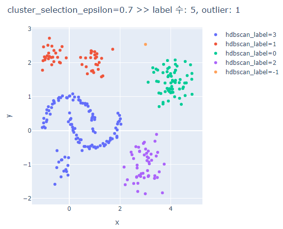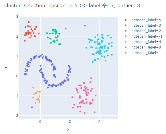 fig.update_layout(width=600, height=500, title=f'cluster_selection_epsilon={cse} >> label 수: {len(set(hdbscan_label))}, outlier: {outliers}')