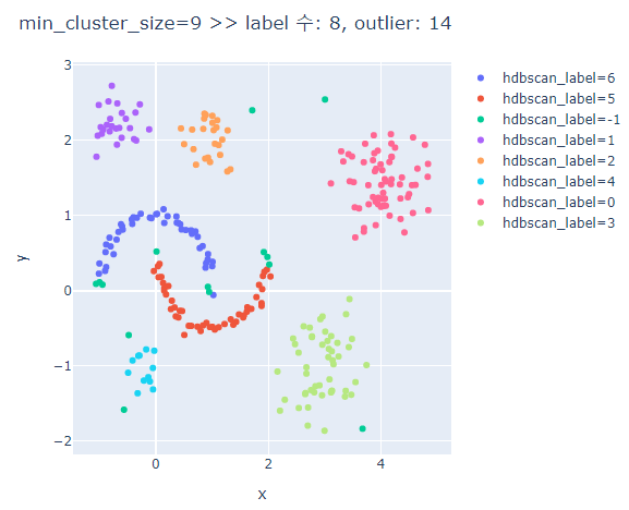 - min_cluster_size (default=5) : 군집화를 위한 최소한의 cluster 사이즈