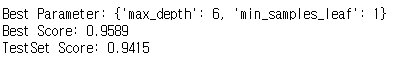 최적의 max_depth는 6, min_samples_leaf는 1로,