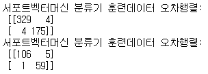 print("서포트벡터머신 분류기 훈련데이터 오차행렬:\n", svm_confusion_test)