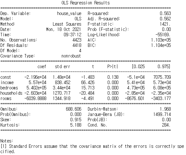 R-squared: 0.546 → 54.6% 수준으로 회귀직선(예측값)과 실제값이 일치한다.