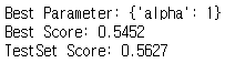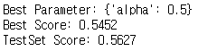 최적의 alpha는 0.5로, 이때 훈련 데이터의 정확도는 54.5%, 테스트 데이터의 정확도는 56.3% 이다.