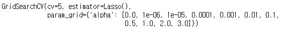 - alpha : 값이 클수록 계수를 0에 가깝게 제약하여 훈련 데이터의 정확도는 낮아지지만 일반화에 기여한다. (default = 1)