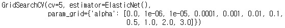 - l1_ratio : 릿지와 라쏘의 규제 비율에 대한 가중 정도