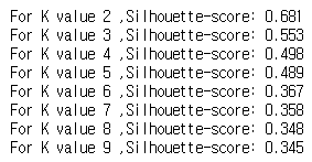군집수를 2~10 까지 변경하면서 실루엣 스코어(silhouette-score)를 찾는다.