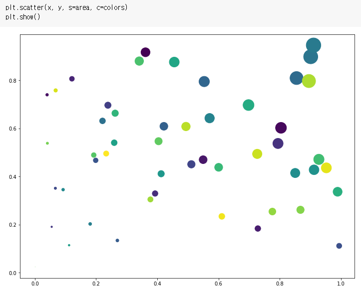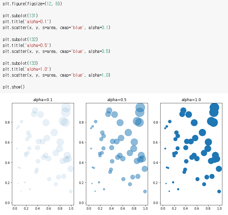 s: 점의 넓이 / c: 점의 색상 / cmap: 모두 같은 점의 색상 / alpha: 점의 투명도