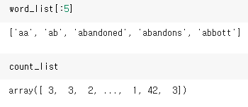 count_list = bow_vect.toarray().sum(axis=0) # 각각의 단어들이 몇 번 등장하는지