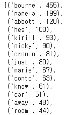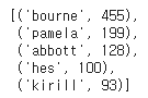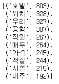sorted(word_count_dict.items(), key=operator.itemgetter(1), reverse=True)[:5] # 빈도 수가 높은 상위 5개 단어 출력