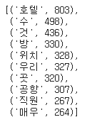 nouns = [x for x in nouns if len(x) > 1] # 한글자 명사 제거